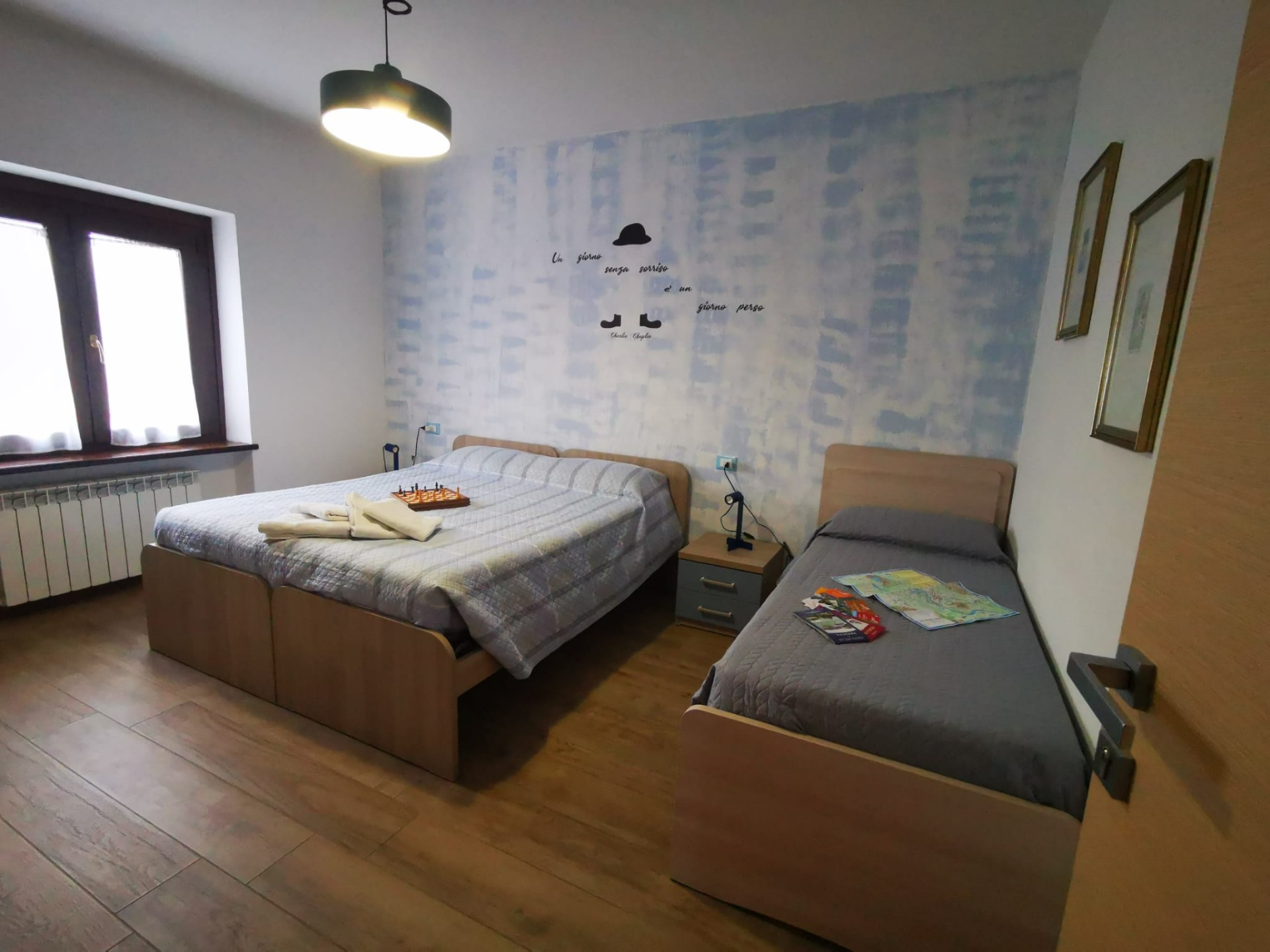 La stanza Cielo è un'ampia stanza tripla, letto matrimoniale + letto singolo, a richiesta il letto matrimoniale è divisibile e si hanno 3 letti singoli, sempre su richiesta e a pagamento si può avere il lettino per i bambini